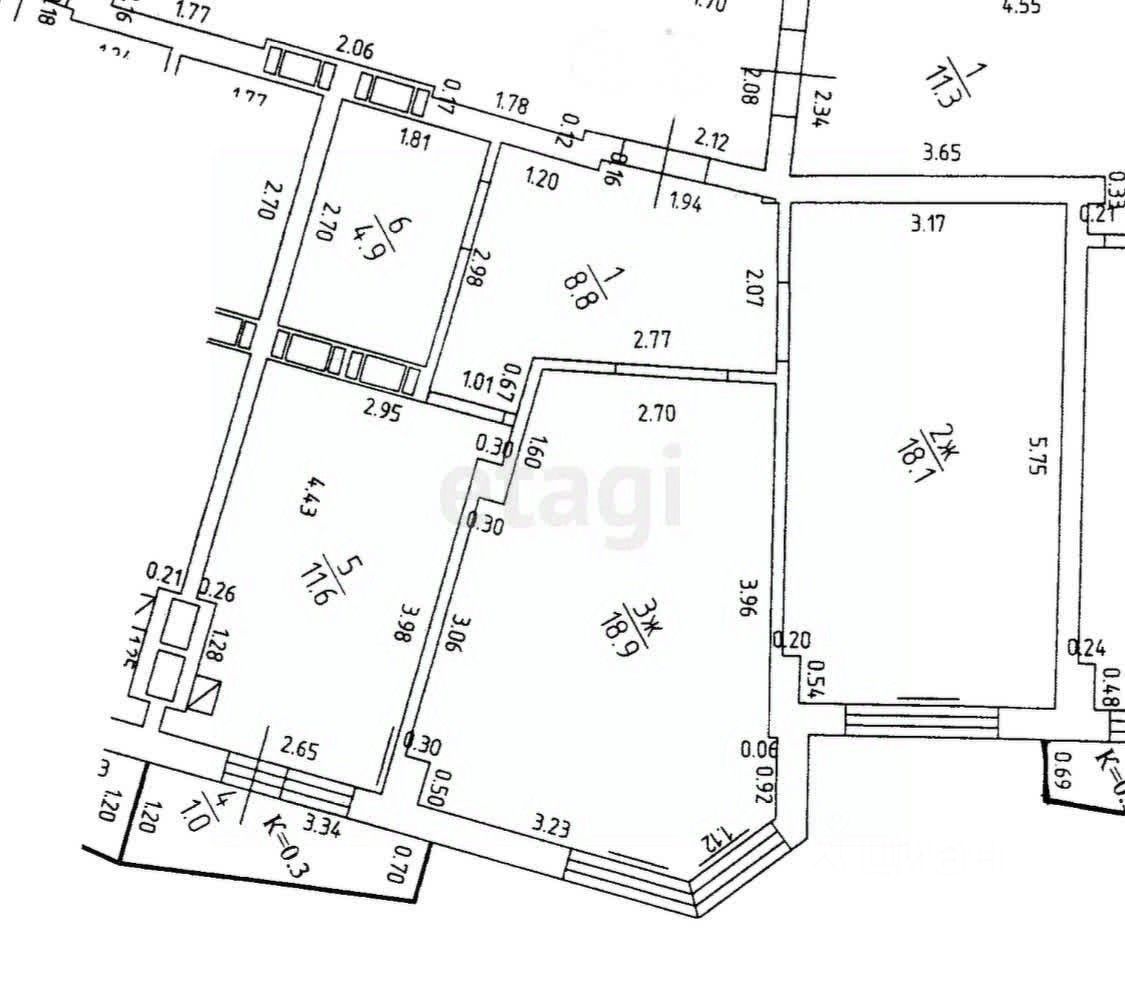- спальня 18.1 м.кв. разделена большим удобным вместительным шкафом на две зоны: спальню с двухспальной кроватью и детскую комнату.
