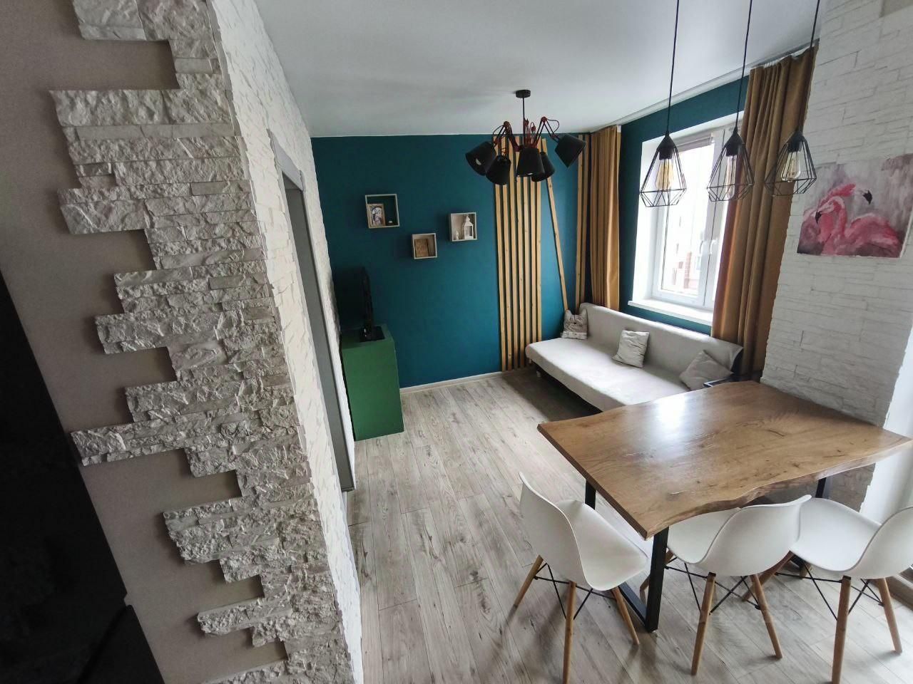 Деревянные стеновые панели в спальне на прикроватной зоне. Гипсовые стеновые панели в кухне-гостиной.
