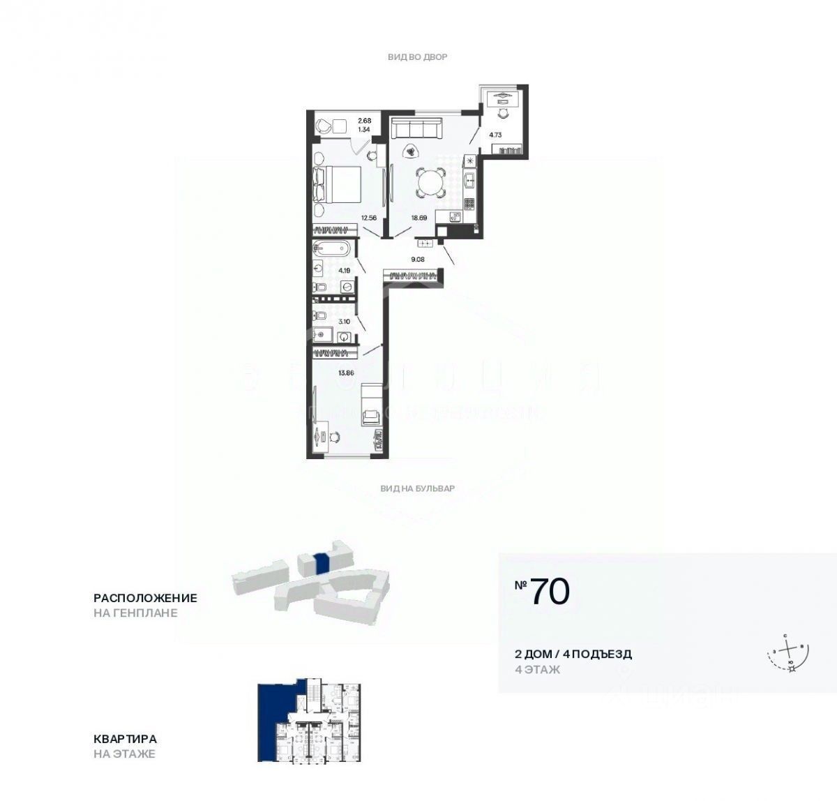 Общая площадь квартиры 67.47 кв. м, продуманная планировка, которая максимально эффективно позволит создать любой интерьер: просторная кухня-гостиная 18.89 кв.м с кабинетом, спальня 12.58 кв.м с выходом на лоджию, спальня 13.86 кв.м с панорамным остеклением, гостевой санузел и ванная комната. Благодаря высоким потолкам и панорамному остеклению все помещения наполняются светом, это создает простор и комфорт для проживания. Автономное отопление. Предчистовая отделка квартиры позволит осуществить любые дизайнерские идеи. Окна квартиры по сторонам света ориентированы на север и юг.