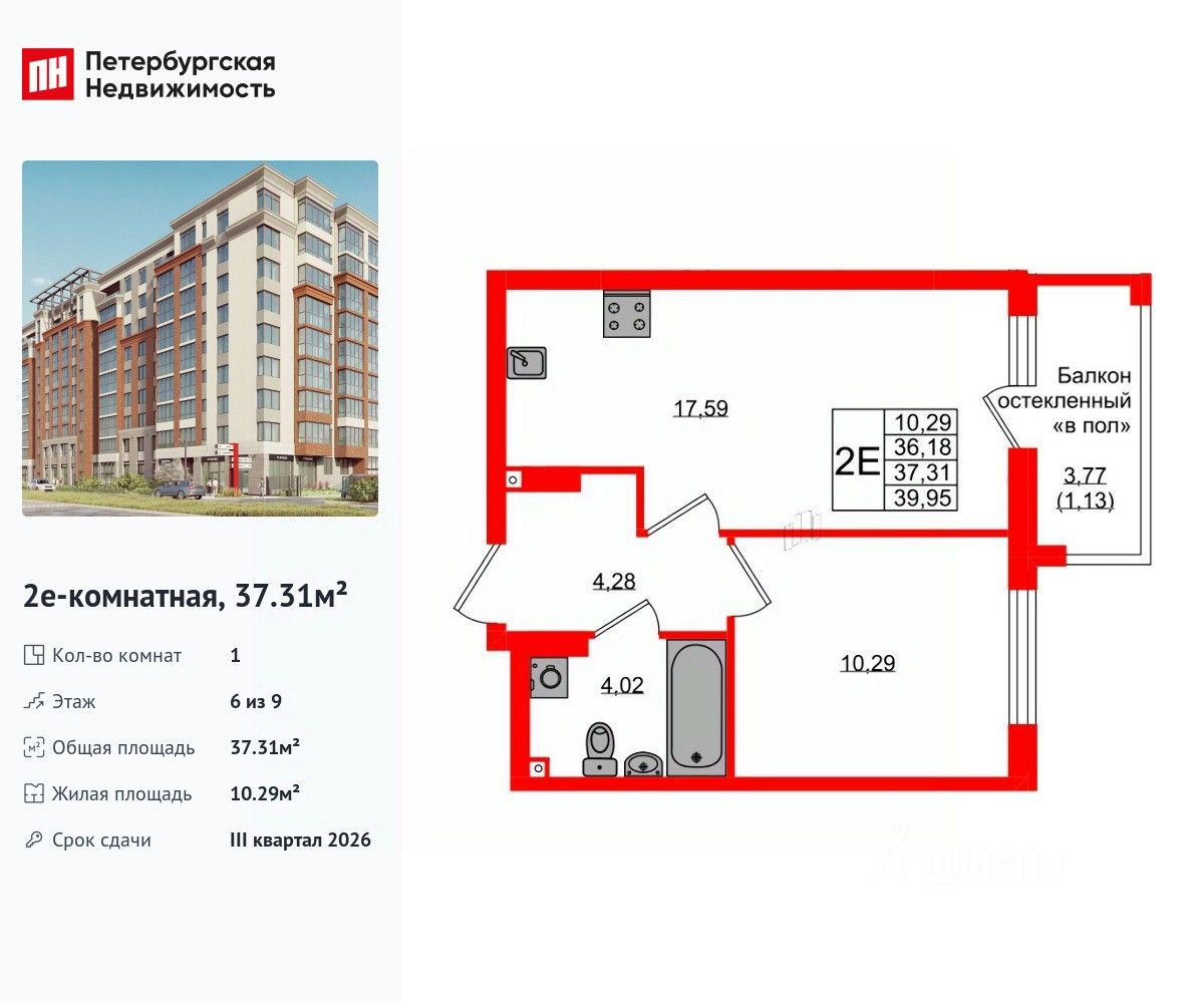 Удобная, классическая, функциональная европланировка, большая кухня-гостиная 17.59 м², просторная прихожая 4.28 м². Общая площадь квартиры - 37.31 м², жилая 10.29 м², высота потолка 2.7 м.