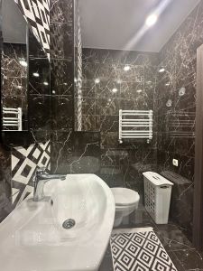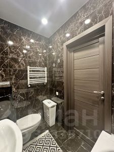Просторный совместный санузел, где помещается вся необходимая сантехника, включая глубокую ванну и стиральную машинку.