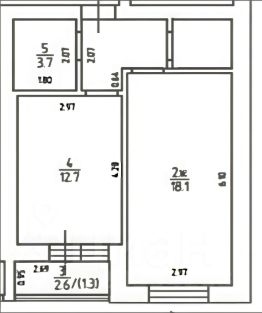 Общая площадь 44 кв.м: , кухня 12.7 КВ.м, комната 18.1 КВ.м, коридор с гардеробной 7 КВ.м, сан.узел 3.7 КВ.м., лоджия 2.6 КВ.м