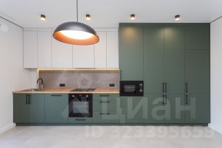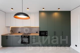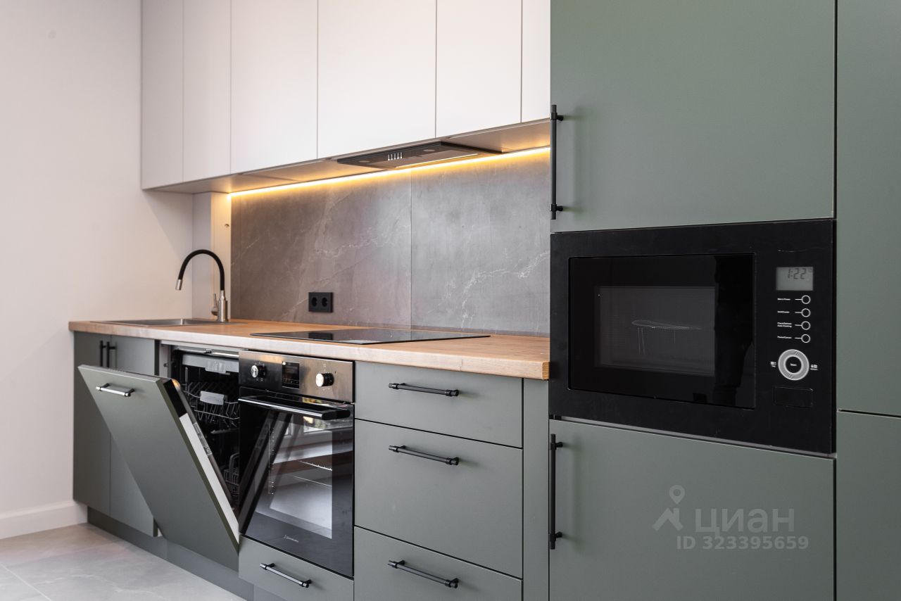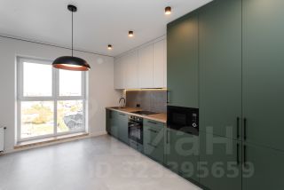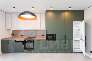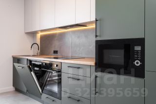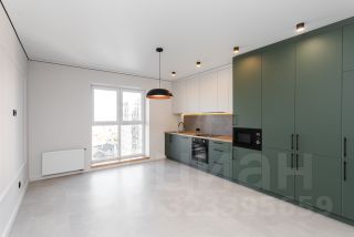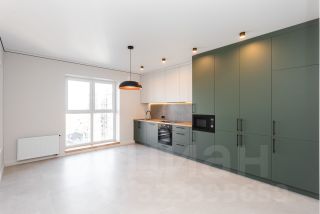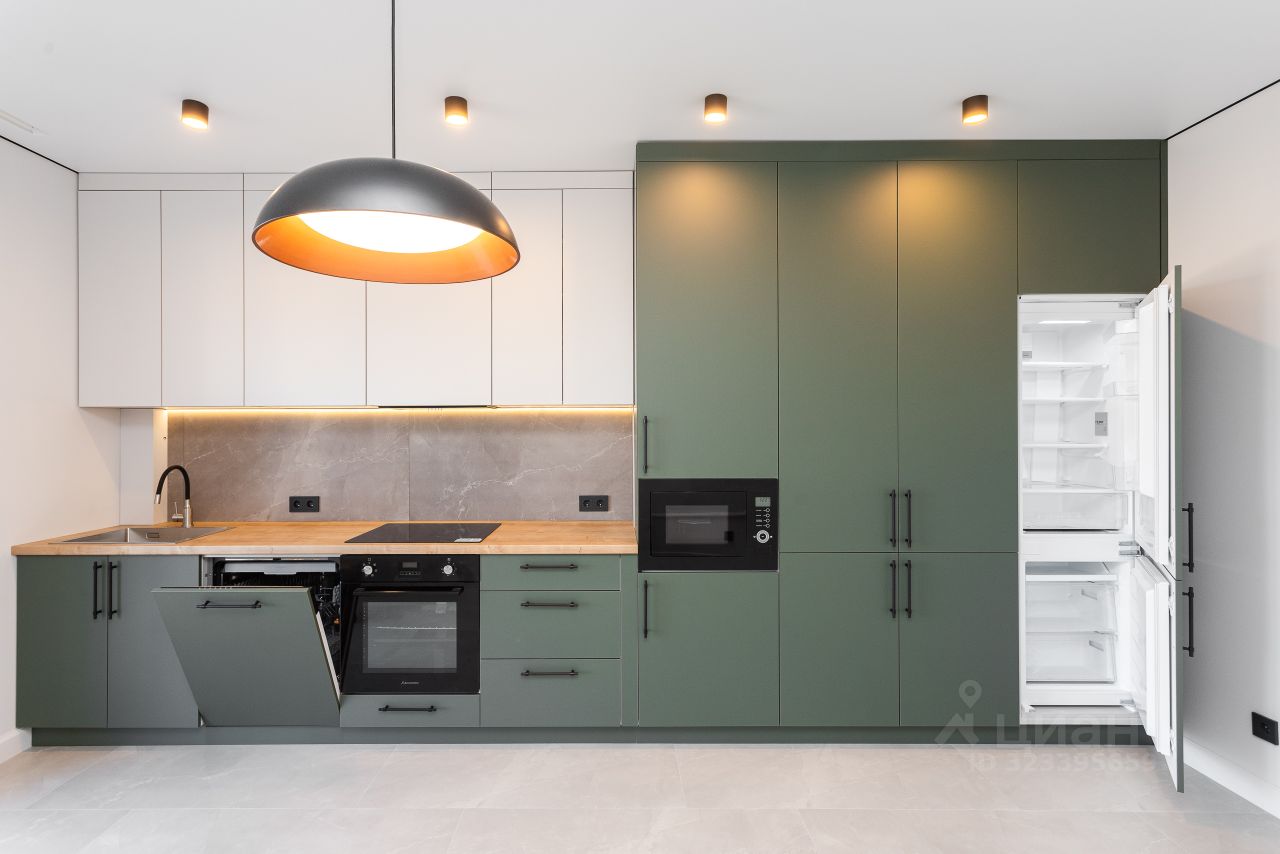 Просторная кухня-гостиная (19,8 м2) включает в себя кухонный гарнитур со встроенной техникой (вытяжка, посудомоечная машина, варочная поверхность, холодильник, духовой шкаф). Окно с панорамным остеклением.