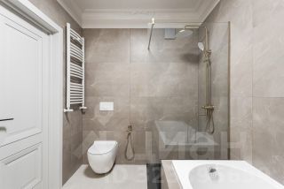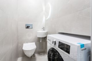 Санузел раздельный (1,6 и 5,7 м2) в темных тонах, сантехника Jaquar: ванна, гигиенический душ, унитаз подвесной с инсталляцией. Большая раковина со стильной тумбой. Стиральная машина. На полу и стенах керамогранит.