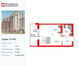 Удобная, классическая, функциональная европланировка, большая кухня-гостиная 3.55 м², просторная прихожая 3.31 м². Общая площадь студии - 25.56 м², жилая 13.32 м², высота потолка 3 м.