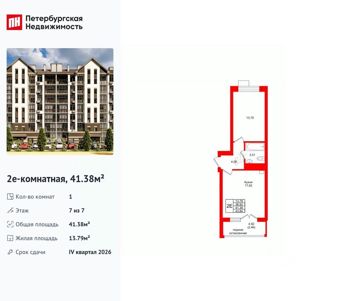 Удобная, классическая, функциональная европланировка, большая кухня-гостиная 17.62 м², вместительная прихожая 4 м². Общая площадь квартиры - 41.38 м², жилая 13.79 м², высота потолка 3.3 м.