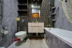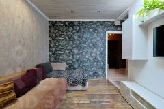 Планировка включает изолированную спальню, гостевую зону, просторную кухню и отдельную комнату, которую можно использовать как детскую или кабинет. Ключевым преимуществом является наличие большой гардеробной зоны, где также можно обустроить полноценное рабочее место.