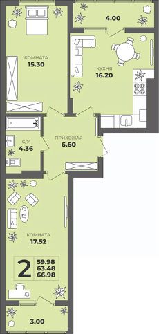 Продаётся 2-комнатная квартира в строящемся доме (Дом 1), срок сдачи: II-кв. 2027, общей площадью 63.48 кв.м., на 4 этаже. ЖК "ГРИНВУД".