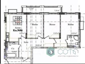 Комнаты 16,86 м², 12,95 м² и 12,85 м²
