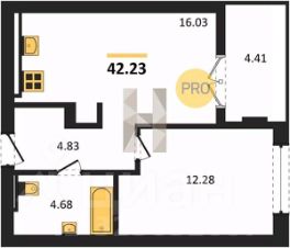 Квартира: 1 к 42,23 кв.м., 7 этаж в комплексе Включи, 5 очередь, корп.10, сдача: 3кв. , этажей: 7, адрес Гурьевск г., Героя России Катериничева ул., , Застройщик: ССК. Номер в базе: J31260L26897