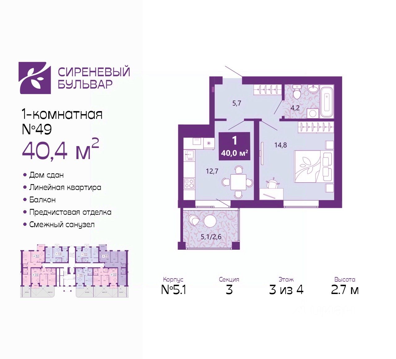Однокомнатная квартира с предчистовой отделкой в ЖК "Сиреневый бульвар" на 3 этаже. Общая площадь: 40.4 кв.м., жилая: 14.8 кв.м., площадь просторной кухни-столовой: 12.7 кв.м. Все окна выходят на одну сторону. В квартире один балкон, один совмещенный санузел. Высота потолков 2.7 м.