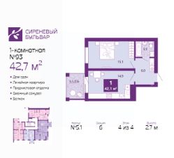 Продается 1-комн. квартира с предчистовой отделкой в ЖК "Сиреневый бульвар" на 4 этаже. Общая площадь: 42.7 кв.м., жилая: 15.6 кв.м., площадь просторной кухни-столовой: 14.5 кв.м. Все окна выходят на одну сторону. В квартире один балкон, один совмещенный санузел. Высота потолков 2.7 м.