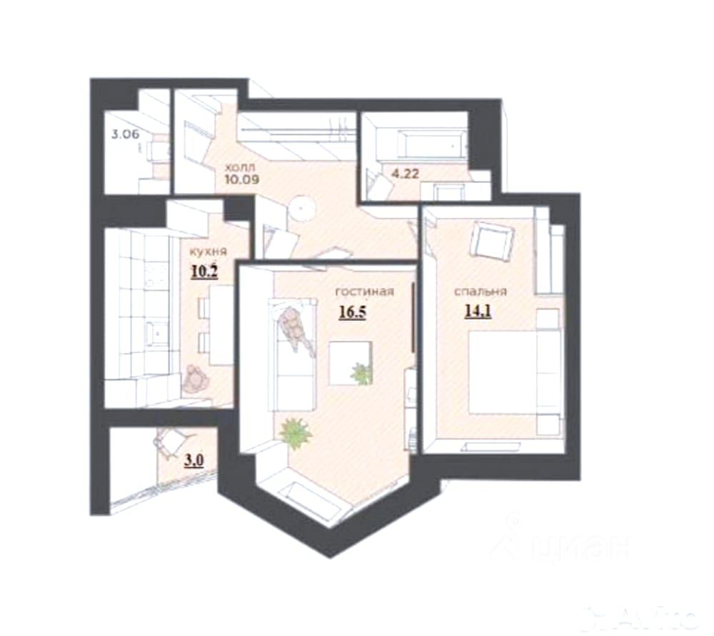 Площадь: 61,85 кв.м. (с учетом лоджии), две комнаты (16,5 и 14,1 кв.м.) кухня - 10,2 кв.м., два санузла (4,22 кв.м. и 3,06 кв.м.) и удобная, функциональная прихожая;