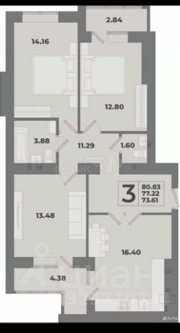 - Общая площадь квартиры составляет 80,83 кв.м., жилая площадь занимает 40,44 кв.м.