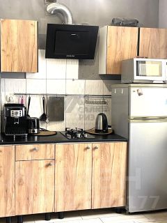 Кровать с тумбочками, встроенная кухня, холодильник, микроволновка, двухкомфорочная плита,
