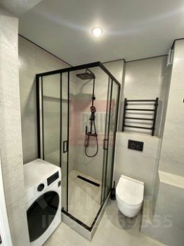 Стены идеально выровнены и окрашены; в санузле керамогранитная плитка, установлена вся сантехника (+ стиральная машина). Выложен ламинат.