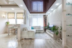 • Дизайнерские потолки: Уникальные потолки с подсветкой в несколько уровней разделяют пространство на зоны, добавляя элегантности и стиля.