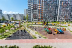 с наземными парковками, автоматами с артезианской водой, качелями, горками, песочницами, уличными тренажерами, полем для спортивных игр, велодорожками, газонами, цветочными клумбами и ландшафтным озеленением.