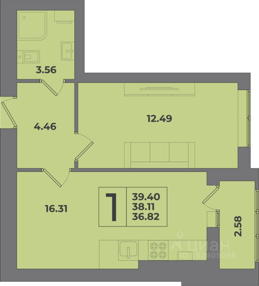 Общая площадь39,4 м²