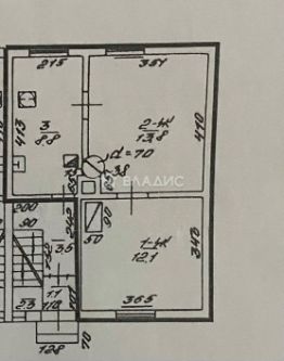 Общая площадь 34,7 кВ.м. Две изолированные комнаты 12,1 кВ. м., 13,8 кВ. м. Кухня 8,8 кВ. м.