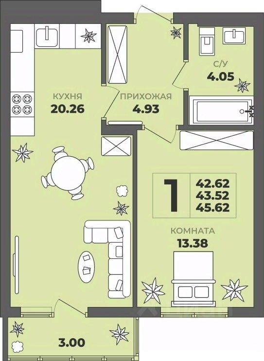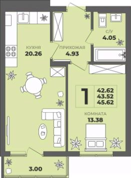 Продаётся 1-комнатная квартира в строящемся доме (Дом 1), срок сдачи: II-кв. 2027, общей площадью 43.52 кв.м., на 7 этаже. ЖК "ГРИНВУД".