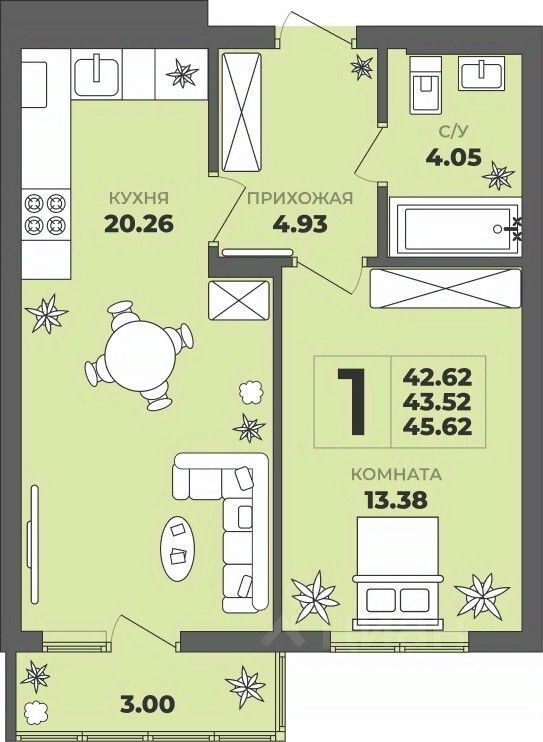 Продаётся 1-комнатная квартира в строящемся доме (Дом 1), срок сдачи: II-кв. 2027, общей площадью 43.52 кв.м., на 2 этаже. ЖК "ГРИНВУД".