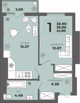 Продаётся 1-комнатная квартира в строящемся доме (Дом 2), срок сдачи: II-кв. 2027, общей площадью 39.8 кв.м., на 8 этаже. ЖК "ГРИНВУД".