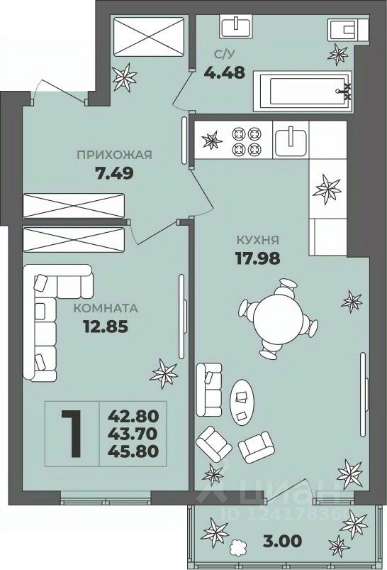 Продаётся 1-комнатная квартира в строящемся доме (Дом 2), срок сдачи: II-кв. 2027, общей площадью 43.7 кв.м., на 4 этаже. ЖК "ГРИНВУД".