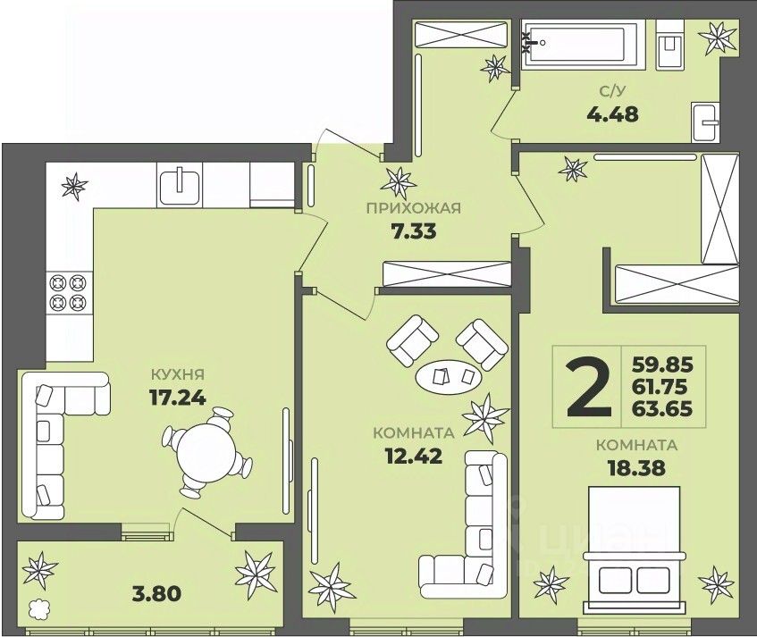 Продаётся 2-комнатная квартира в строящемся доме (Дом 2), срок сдачи: II-кв. 2027, общей площадью 61.75 кв.м., на 2 этаже. ЖК "ГРИНВУД".