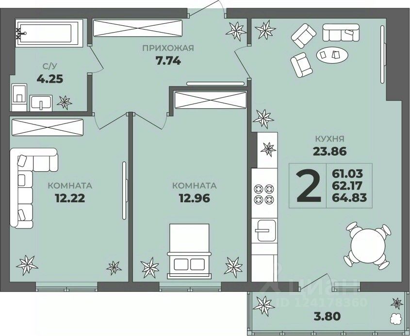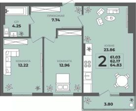 Продаётся 2-комнатная квартира в строящемся доме (Дом 2), срок сдачи: II-кв. 2027, общей площадью 62.17 кв.м., на 1 этаже. ЖК "ГРИНВУД".