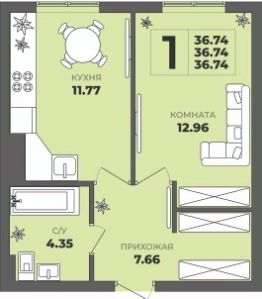 Продаётся 1-комнатная квартира в строящемся доме (Дом 2), срок сдачи: II-кв. 2027, общей площадью 36.74 кв.м., на 1 этаже. ЖК "ГРИНВУД".