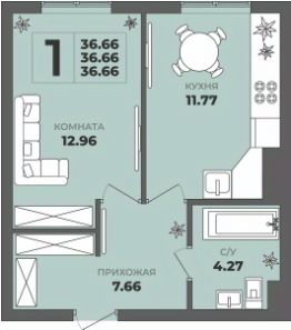 Продаётся 1-комнатная квартира в строящемся доме (Дом 2), срок сдачи: II-кв. 2027, общей площадью 36.66 кв.м., на 1 этаже. ЖК "ГРИНВУД".