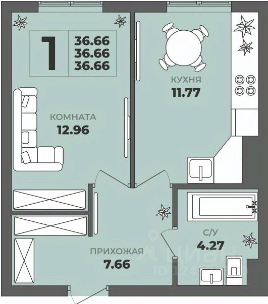 Продаётся 1-комнатная квартира в строящемся доме (Дом 2), срок сдачи: II-кв. 2027, общей площадью 36.66 кв.м., на 1 этаже. ЖК "ГРИНВУД".