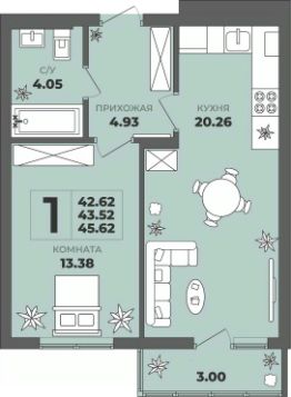Продаётся 1-комнатная квартира в строящемся доме (Дом 1), срок сдачи: II-кв. 2027, общей площадью 43.52 кв.м., на 7 этаже. ЖК "ГРИНВУД".