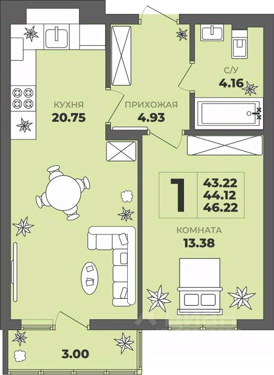 Продаётся 1-комнатная квартира в строящемся доме (Дом 1), срок сдачи: II-кв. 2027, общей площадью 44.12 кв.м., на 1 этаже. ЖК "ГРИНВУД".