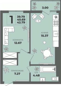 Продаётся 1-комнатная квартира в строящемся доме (Дом 2), срок сдачи: II-кв. 2027, общей площадью 40.69 кв.м., на 8 этаже. ЖК "ГРИНВУД".