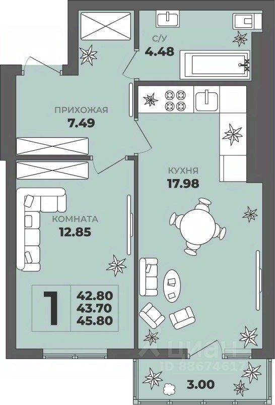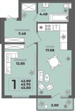 Продаётся 1-комнатная квартира в строящемся доме (Дом 2), срок сдачи: II-кв. 2027, общей площадью 43.7 кв.м., на 3 этаже. ЖК "ГРИНВУД".