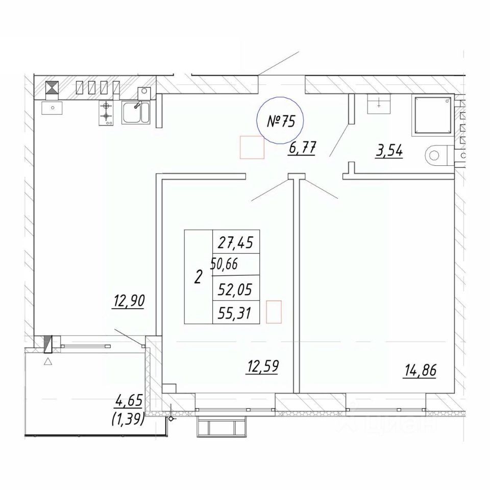 Общая площадь52,05 м²