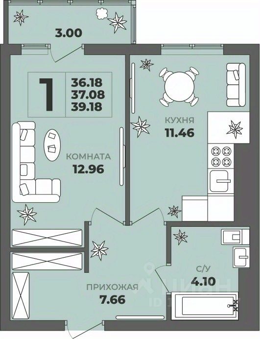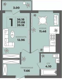 Продаётся 1-комнатная квартира в строящемся доме (Дом 2), срок сдачи: II-кв. 2027, общей площадью 37.08 кв.м., на 5 этаже. ЖК "ГРИНВУД".