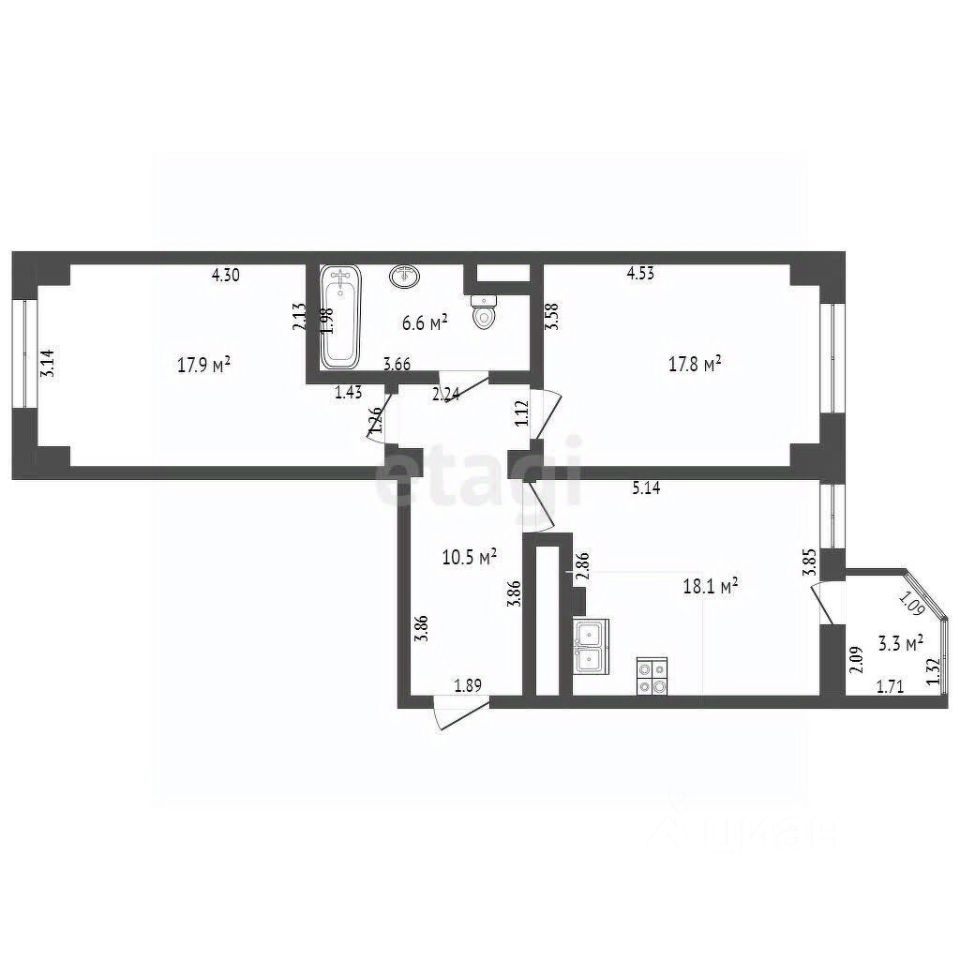 - Две уютные спальни на разный стороны- 17,9 м² и 17,8 м²,