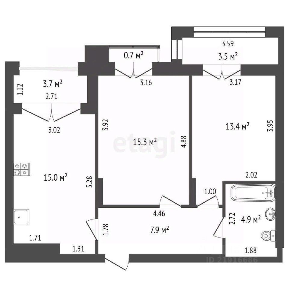 общая площадь квартиры без учёта лоджии и балкона - 56.5 кв.м.
