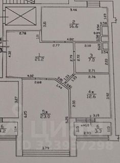 Общая площадь квартиры - 83,7 кв.м., кухня - 16,6 кв.м., комнаты 12,6 кв.м. + 23 кв.м., коридор 21,2 кв.м., лоджия 3,3 кв.м.Санузел совмещенный 7,0 кв.м.