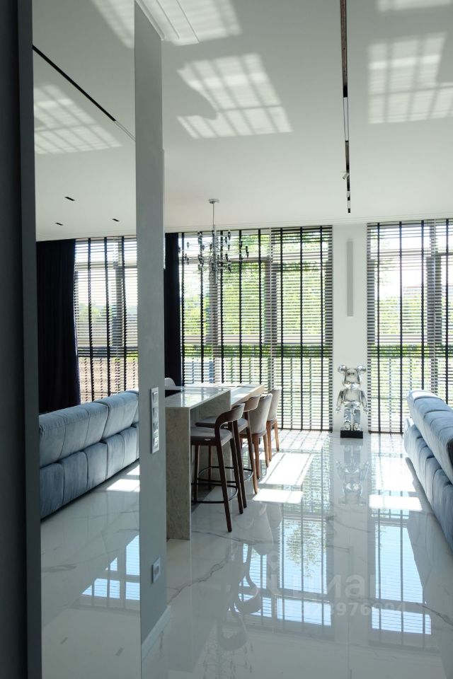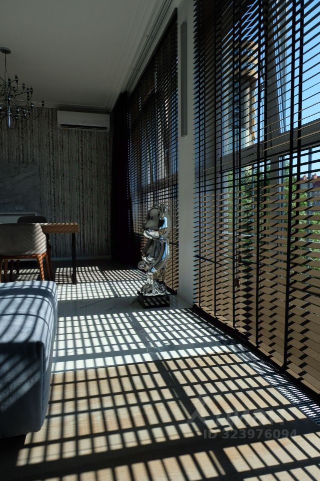 • Просторная гостиная с потолками 3 метра, деревянными жалюзи и электрическими шторами. Стенка с каменным шпоном, биокамином и QLED телевизором Samsung.