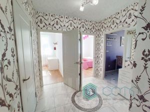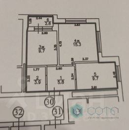 Площадь большой спальни — 15,3 кв.м, маленькой 9,7 кв.м и застекленная лоджия 2,6 кв.м, кухни — 9,7, туалета — 3,9, прихожей — 5,8.