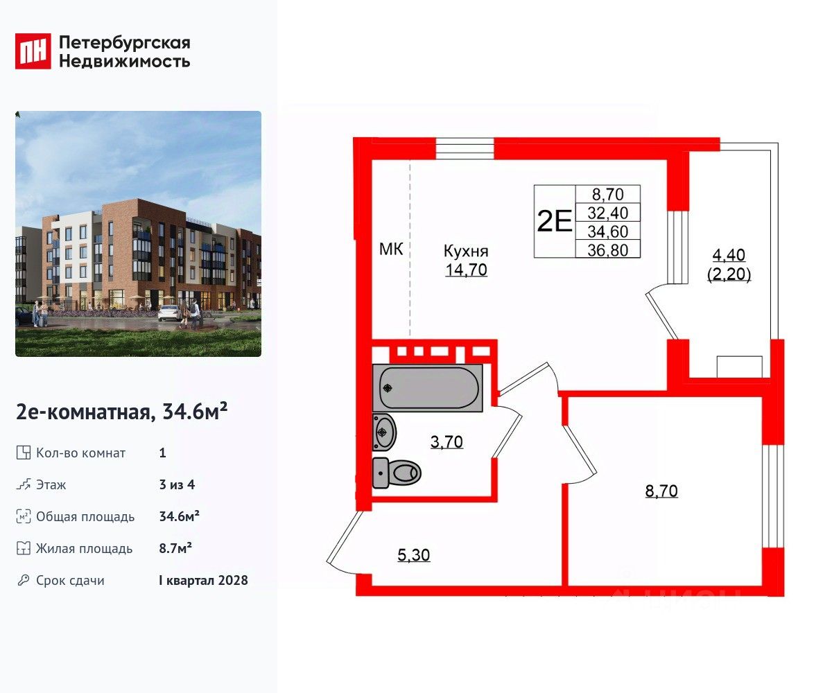 Удобная, классическая, функциональная европланировка, большая кухня-гостиная 14.7 м², просторная прихожая 5.3 м². Общая площадь квартиры - 34.6 м², жилая 8.7 м², высота потолка 2.7 м.