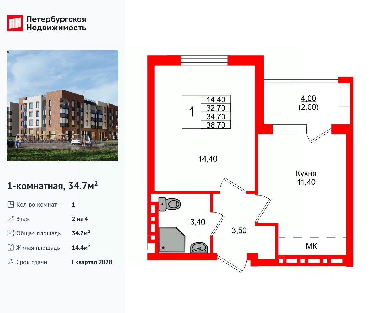 Удобная, классическая планировка, кухня 11.4 м², вместительная прихожая 3.5 м². Общая площадь квартиры - 34.7 м², жилая 14.4 м², высота потолка 2.7 м.