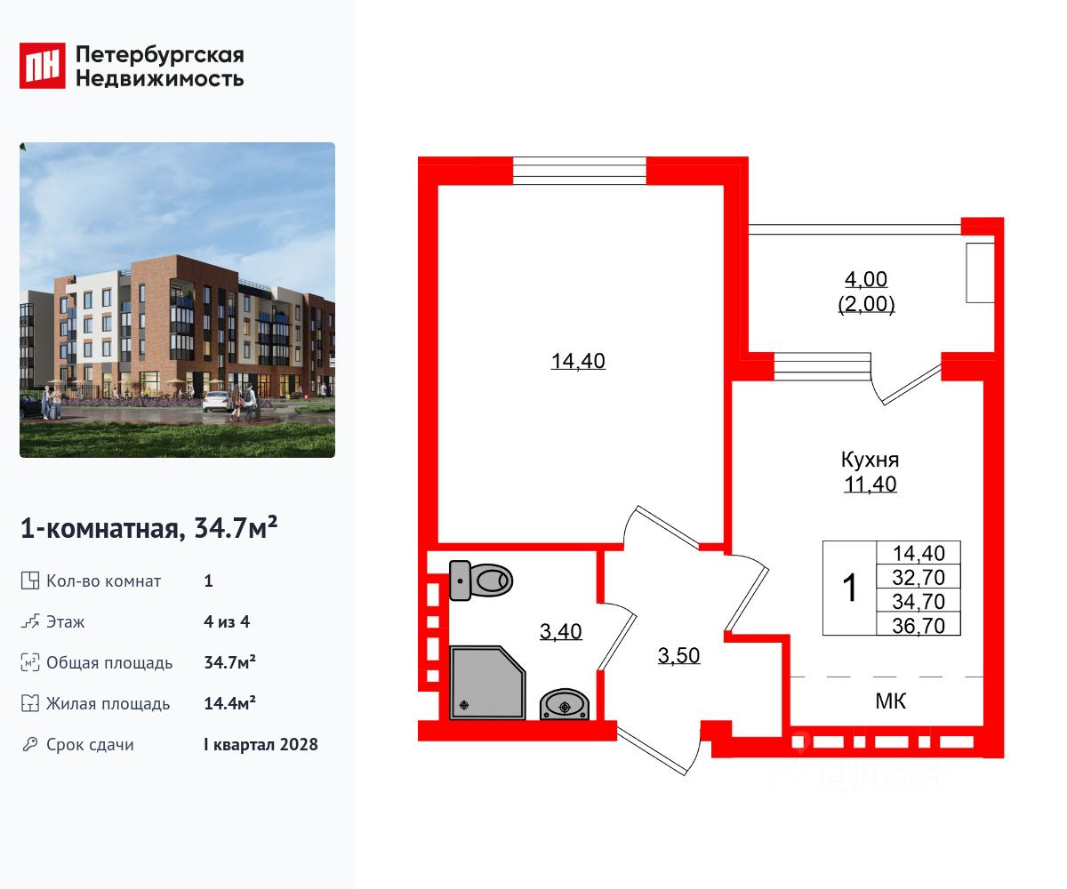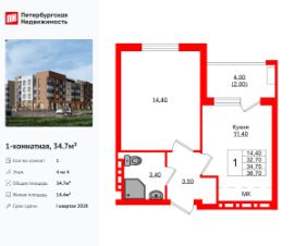 Удобная, классическая планировка, кухня 11.4 м², вместительная прихожая 3.5 м². Общая площадь квартиры - 34.7 м², жилая 14.4 м², высота потолка 3 м.