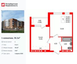Удобная, классическая планировка, кухня 13 м², просторная прихожая 4.5 м². Общая площадь квартиры - 38.2 м², жилая 15 м², высота потолка 3 м.