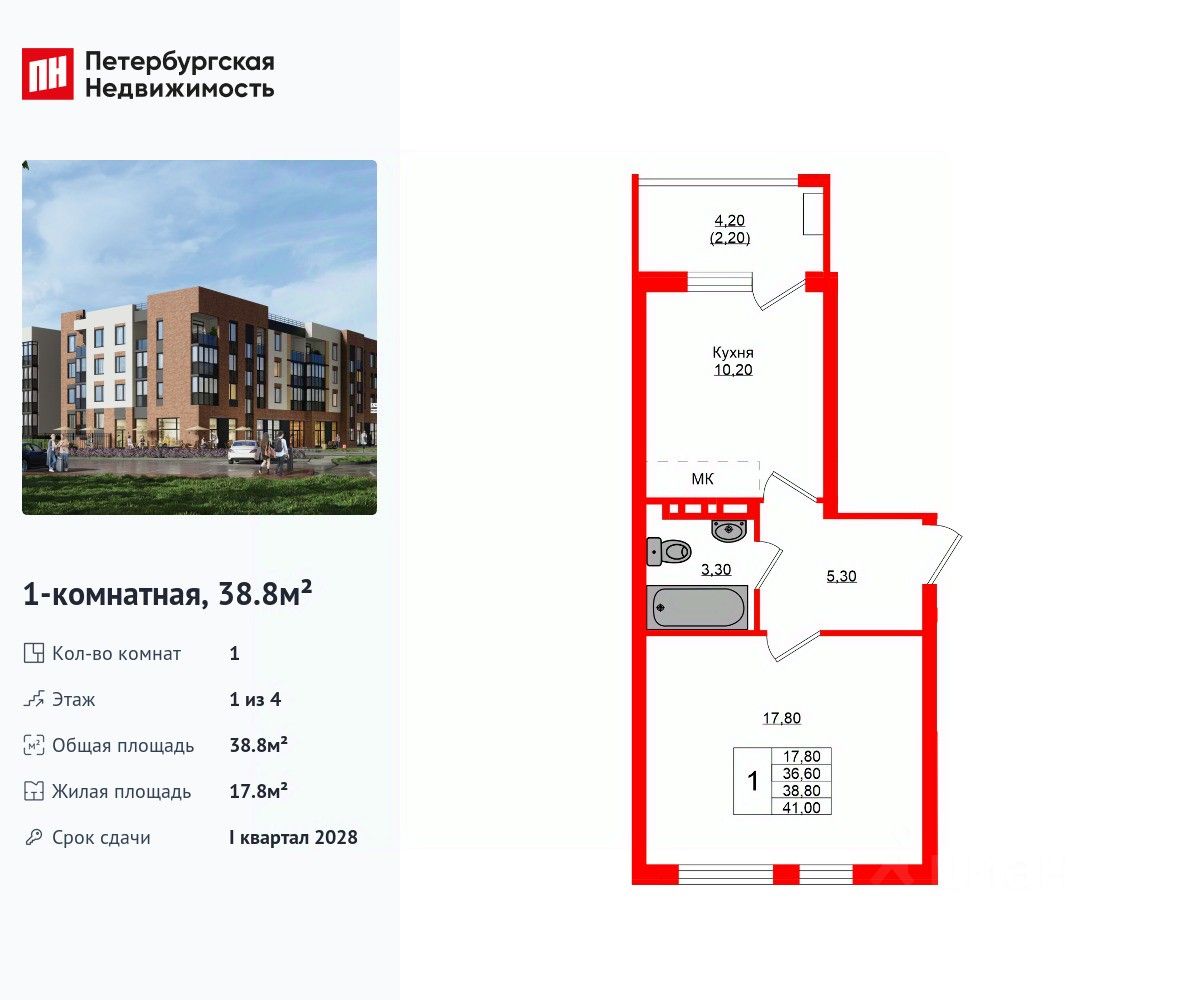 Удобная, классическая планировка, кухня 10.2 м², просторная прихожая 5.3 м². Общая площадь квартиры - 38.8 м², жилая 17.8 м², высота потолка 2.7 м.