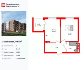Удобная, классическая планировка, кухня 13.2 м², просторная прихожая 7.2 м². Общая площадь квартиры - 40.8 м², жилая 13.9 м², высота потолка 2.7 м.